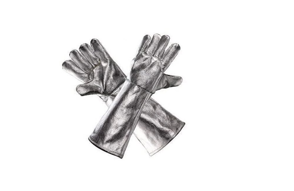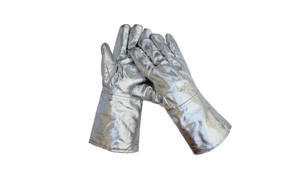 Heat-resistant gloves made from aluminum fabric, designed to protect hands from intense heat in applications such as metalworking and foundries